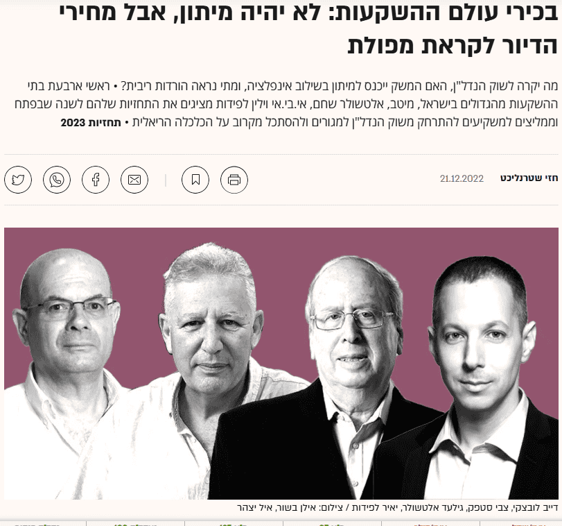 הוכחה נוספת למאבקם של בעלי בתי ההשקעות הללו, קבלנו גם בשנת 2022, השנה בה מחירי הנדל"ן עלו בממוצע בכ- 20-22% בשנה, זה הלחיץ את בעלי בתי ההשקעות וגם אז הם יצאו בפרסום מעל גלובס תוך שהם שוב אומרים בבטחון כי אנו לפני קריסה. והנה היום כמעט 4 שנים אחרי, אמנם יש קפאון בשוק הנדל"ן, אבל צריך לזכור שאנו אחרי תקופה של 3 שנים של מלחמה ב- 7 חזיתות, אז אם מחירי הנדל"ן לא קורסים במציאות ישראלית מורכבת שכזו בעת מלחמה עפ"נ 3 שנים מול לא פחות מ- 7 חזיתות, מענין לאיזו עוד קריסה הם מצפים בימי שלום?